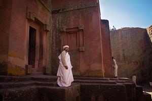 One of the head priests of Lalibela awaits to receive an item from a messenger at Bete Gioris, one of 11 medieval rock-hewn churches in this part of the Amhara region of Ethiopia.